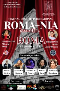 După succesul edițiilor precedente, Festivalul-Concurs Internațional „Roma-Nia” revine la Roma pe 29 iunie 2025 cu o ediție de excepție, dedicată promovării artei, talentului și patrimoniului cultural românesc în diaspora.